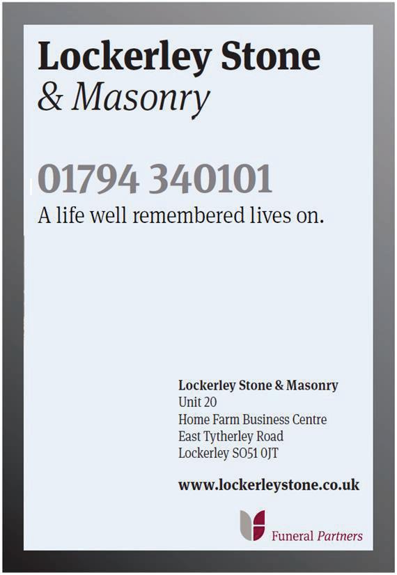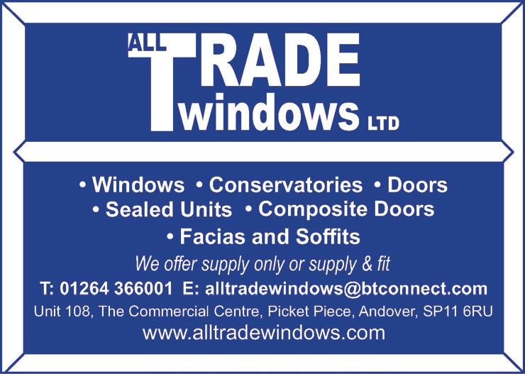 THE ANDOVER Gazette • www.modernmagazines.co.uk Andover’s only independent Family Funeral Directors and Memorial Consultants S.& J. MADDOCKS S.& J. Maddocks offer an experienced, personal and friendly 24-hour service. Local people serving local families for over 25 years. Chapel of Rest • Free Parking • Funeral Plans STATION APPROACH, ANDOVER, SP10 3HN Tel: 01264 355600 sjmaddocks.co.uk •Windows •Doors •Conservatories •Sealed Units •Composite Doors •Facias and Soffits We offer supply only or supply & fit Tel: 01264 366001 Email:alltradewindows@btconnect.com Unit 108, The Commercial Centre Picket Piece, Andover, SP11 6RU www.alltradewindows.com RADE windows LTD T ALL