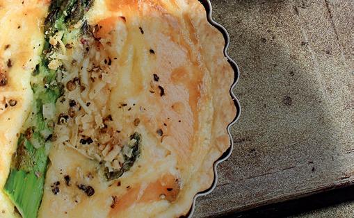 6. Put chunks of the cooked salmon and asparagus into the baked pastry. Spoon the egg mixture in to fill the tarts to the top. Sprinkle over the rest of the Parmesan and bake for 15 mins.