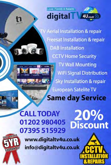 CALL US TODAY: 01202 366636 FREE CALL OUT on request (subject to availability) NO JOB TOO SMALL FREE ESTIMATES FAMILY FIRM Est’d 1991 ALL WORK GUARANTEED COVID RESPONSIBLE ENGINEERS PLUMBING PROBLEMS? DRAIN OR SEWAGE PROBLEMS? OR NEED AN EXPERT? Blocked drains CCTV inspections Burst pipes & water mains Showers sinks & taps Toilet & ball valves Cold water tanks Soakaways & relining Heating & hot water tanks Rapid Response Specialists Friendly Helpful Team We Get the Job Done! Senior citizen discounts 3 Please mention Modern Magazines when contacting advertisers