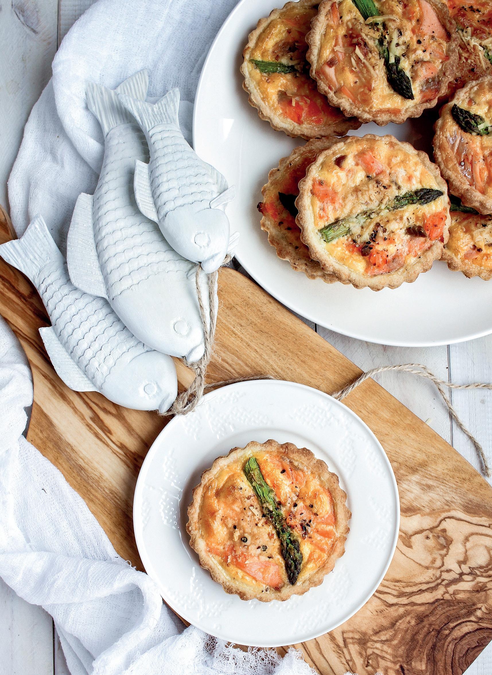 6. Put chunks of the cooked salmon and asparagus into the baked pastry. Spoon the egg mixture in to fill the tarts to the top. Sprinkle over the rest of the Parmesan and bake for 15 mins.