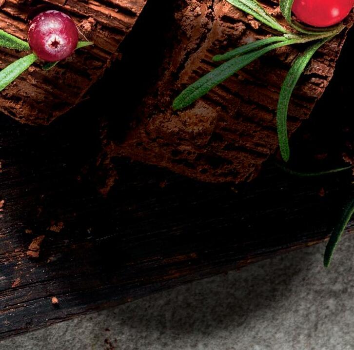 5. Spread the yule log with the remaining icing, covering the cut-o ends. Create a wood-like texture by marking along the length of the log with a skewer or sharp knife and finish with a dusting of icing sugar.