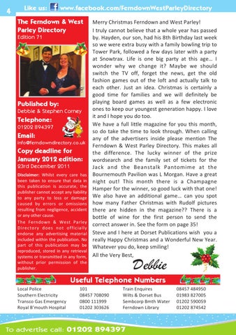 Copy deadline for January 2012 edition: 23rd December 2011 Disclaimer: Whilst every care has been taken to ensure that data in this publication is accurate, the publisher cannot accept any liability to any party to loss or damage caused by errors or omissions resulting from negligence, accident or any other cause. The Ferndown & West Parley Direc to ry d oe s n o t o ffic ially endorse any advertising material included within the publication. No part of this publication may be reproduced, stored in any retrieval systems or transmitted in any form, without prior permission of the publisher.