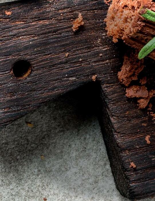 5. Spread the yule log with the remaining icing, covering the cut-o ends. Create a wood-like texture by marking along the length of the log with a skewer or sharp knife and finish with a dusting of icing sugar.
