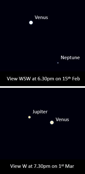 A conjunction is when objects in the night sky appear close to one another as viewed from Earth, even though they are actually thousands of miles apart in space. One such event happens at the end of the month when the two bright planets Venus and Jupiter appear extremely close to one another in the early evening western sky (see figure). The closest they reach is actually on March 1st, but they will be approaching each other rapidly the week beforehand, noticeably changing position and moving nearer to one another nightly. This conjunction can be easily seen with the naked eye, but a pair of good, steady binoculars may allow you to spot some of the moons of Jupiter.