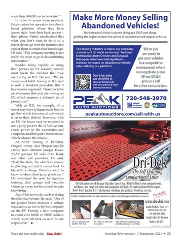 want their $80,000 car to be skated.” In order to access these manuals, Fabris points his operators to a cloudbased platform where they have access right from their back pocket – their phone. Fabris emphasized that what you don’t want to do is sit a tower down, go over the manuals and expect them to retain that knowledge. He said, “The company meeting is not really the route to go in disseminating information.” Besides being capable of using their phones for EV research, towers must break the mindset that they are towing an ICE. He said, “We are creatures of habit. Towing an ICE unit is such a standard procedure that it has become ingrained. There has to be an awareness that you are towing an EV, which requires a different set of procedures.” With an ICE, for example, all a tower may have to figure out is how to get the vehicle into neutral and winch it on to their flatbed. However, with an EV, the tower may be required to use a jump pack to the 12 Volt system, create power to the accessories and computer, and then put it in tow mode, which releases the wheels. At ASAP Towing in Portland, Oregon, owner Alex Shopen says he carries four different jumper boxes. ASAP services EV calls from Honk and other call providers. He said, “Half the time, the electrical system is glitching out and it comes back to life with a charge. What’s critical to know is where those jump points are.” He mentioned the need for rigorous training, chat groups and youtube videos as a way for his drivers to gain knowledge. And what not to do, such as frying the electrical system. He said, “One of my jumper boxes includes a voltage regulator so as not to fry the computer on the EV. Putting a new computer in could cost $6000 to $8000 dollars, which could fall back on us if we are responsible.”