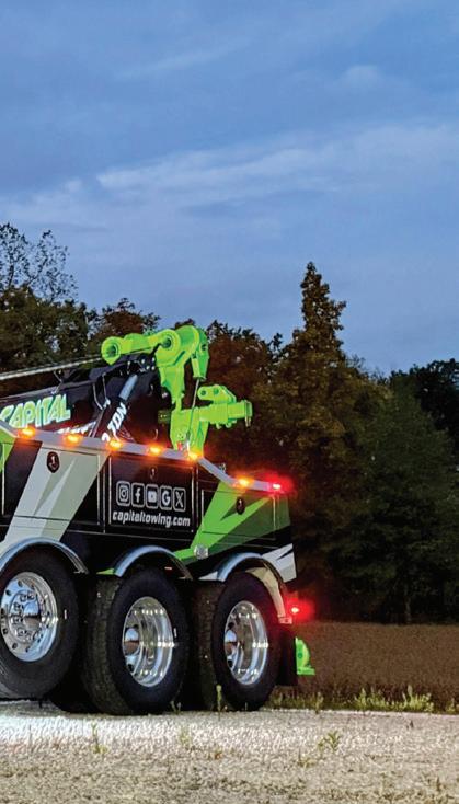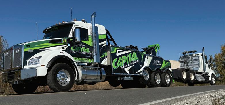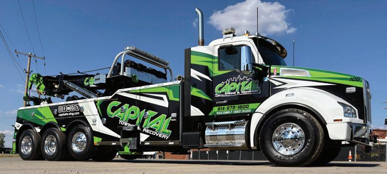 more than 100 pieces of equipment and around 60 power units. The new look was produced by Best Graphics in Westerville, Ohio, which also wrapped Capital’s newest unit, the Custom Built 30ton wrecker shown here. ◀