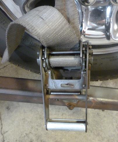 When a ratchet is used in the wheel securement strap, make sure the strap wraps around the barrel of the ratchet a minimum of two complete times. This is another common mistake that occurs in the field. If some of the metal barrel of the ratchet is visible, the strap will most likely loosen during the tow. The strap must go around the barrel of the ratchet at least two times in order to achieve what is referred to as fiber lock, in order to prevent the strap from working its way loose.