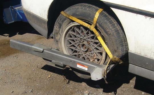 to most wheel-lift securement straps. Use both wheel securement straps on every tow. Often tow operators towing a vehicle down the roadway use only one wheel securement strap. This is not a safe and secure tow. In a hard stop or collision, the towed vehicle’s wheel on the unsecured side may roll forward and off of the wheel-lift grid. It may also cause the wheel securement strap on the secured side to come loose, resulting in a failure of the primary securement.