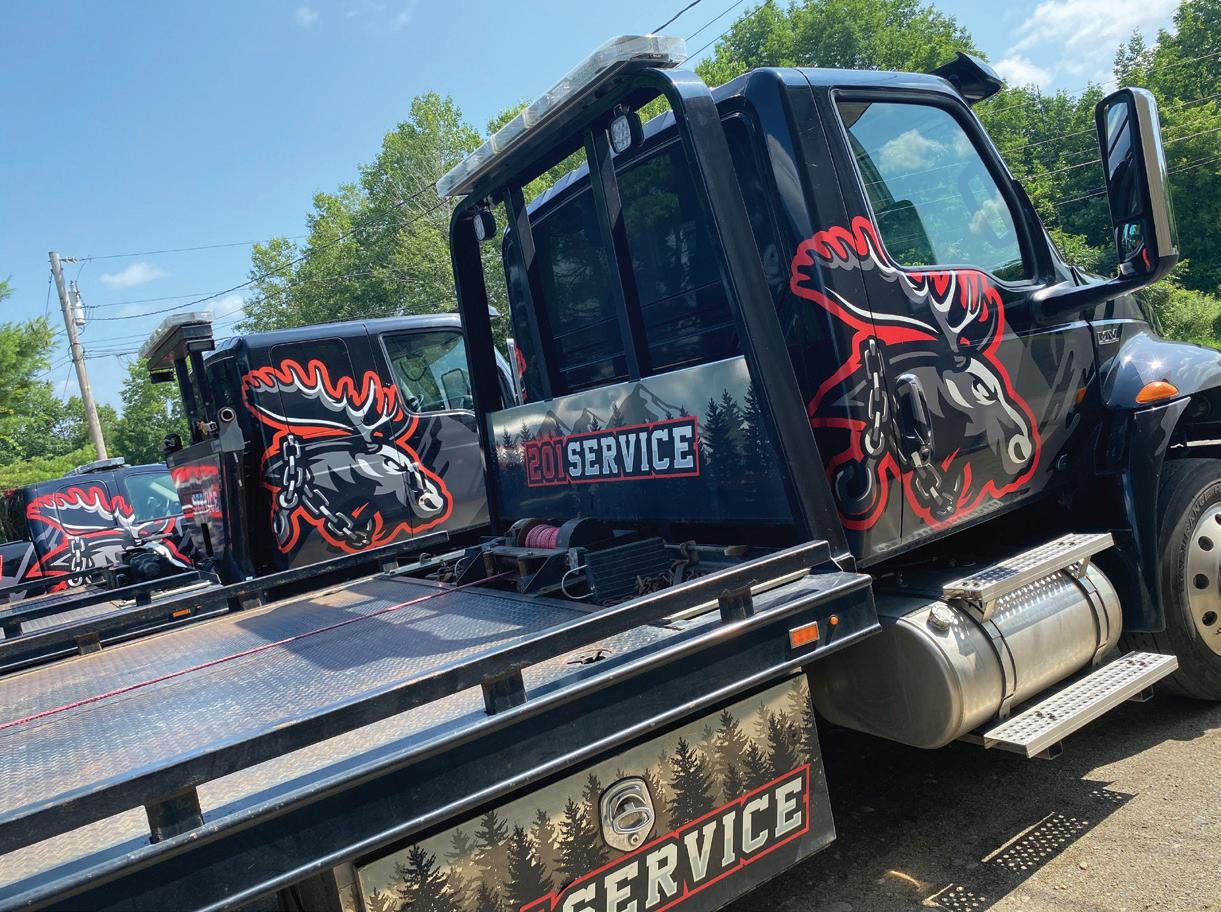 At 201 Service Towing in Maine, the company’s vivid imagery extends beyond its fleet and into its reception area, along with various customer touch points such as pens, notepads, and stickers. This unified approach creates an easily remembered customer experience that reinforces the company’s brand identity.