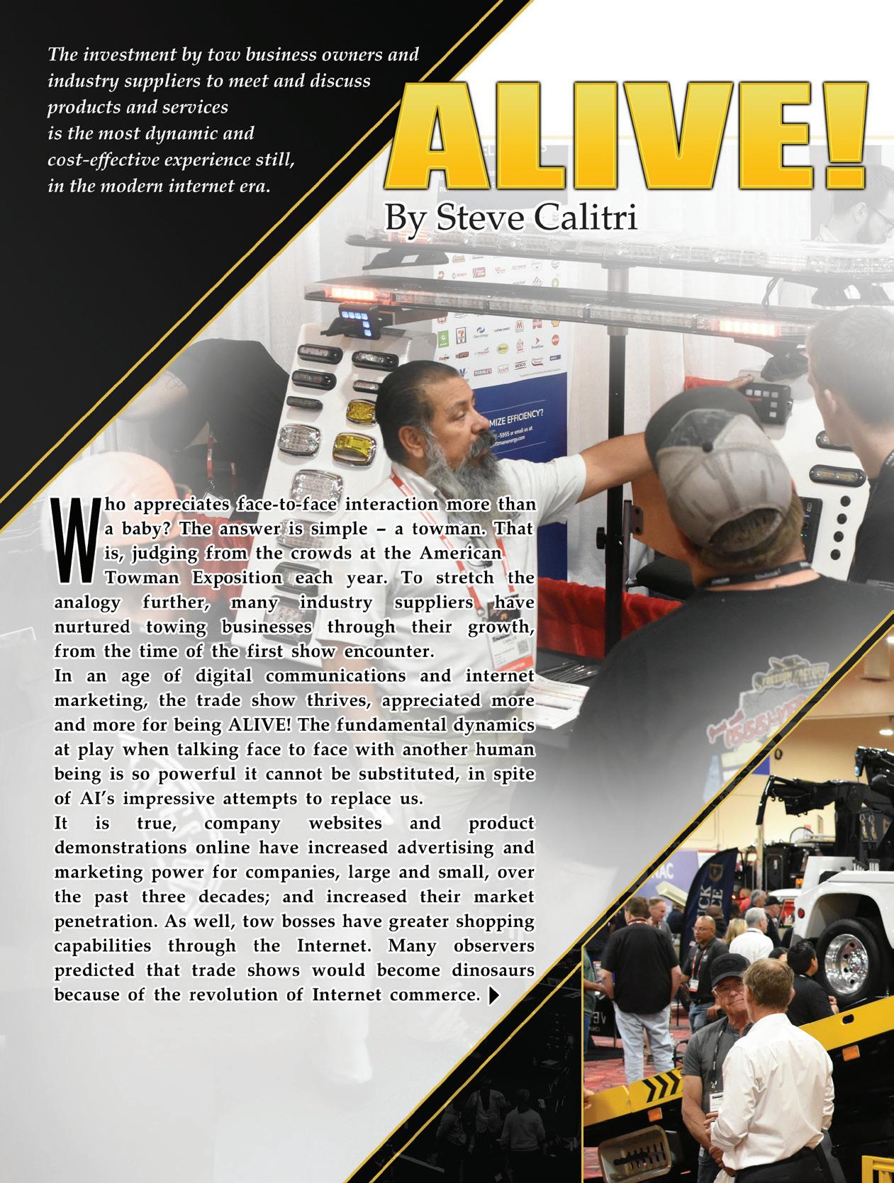 The beat goes on. As I write, individual towmen are working to ensure that recovery bills can’t be dodged, associations are strengthened by AI, the latest wrecker innovations will be ready to show, and this power of individualism is harnessed to electrify the coming American Towman Exposition XXXVI.