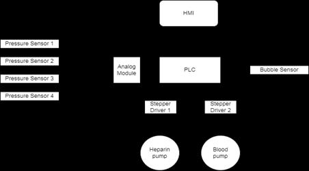 Figure 1 shows the overview of the system for the localized dialysis machine. The PLC controls the pumps speed and process data from the sensors to be displayed in the HMI. An analog module converts the data from the pressure sensors to the PLC. Moreover, an Arduino microcontroller is responsible for the servo motors.