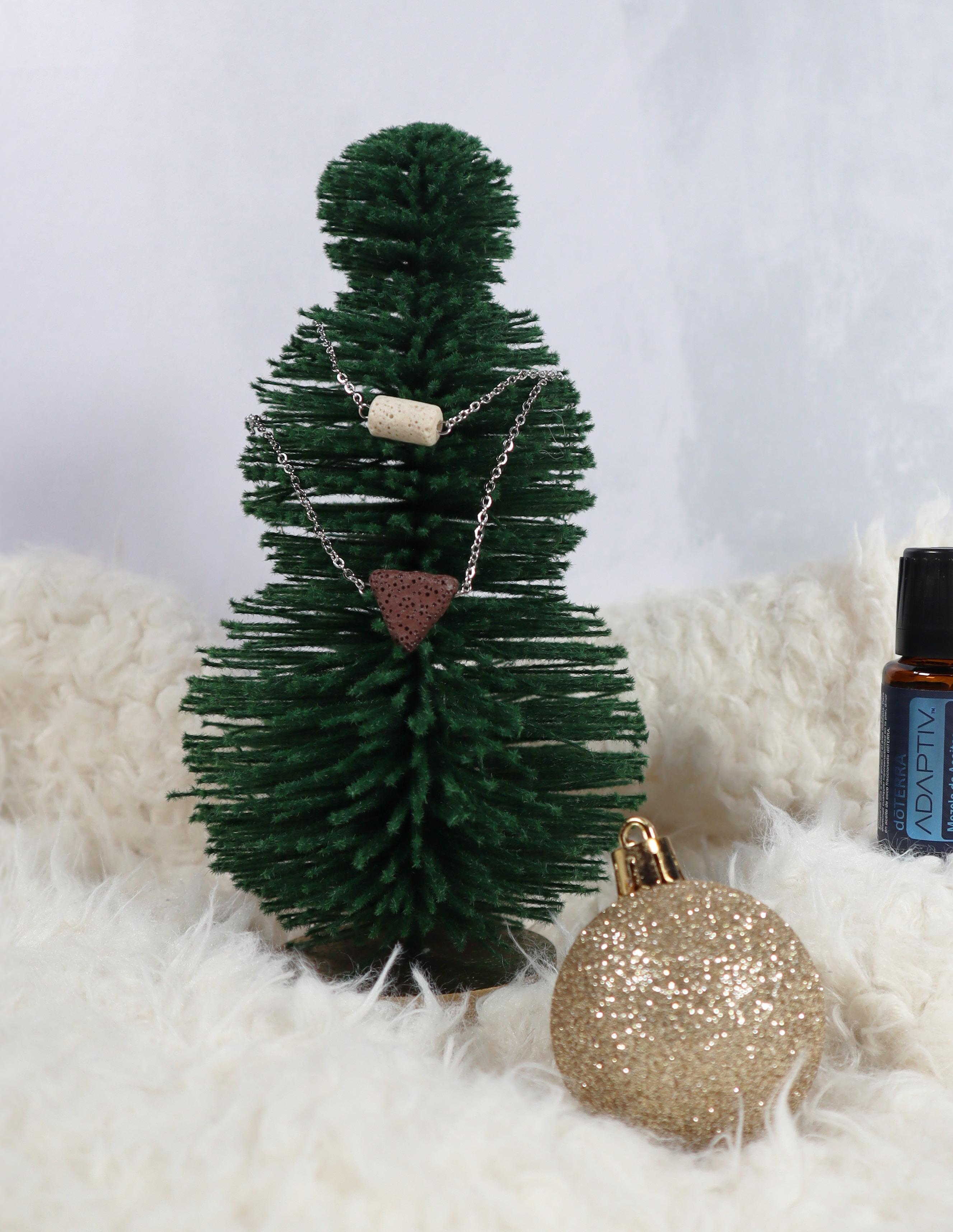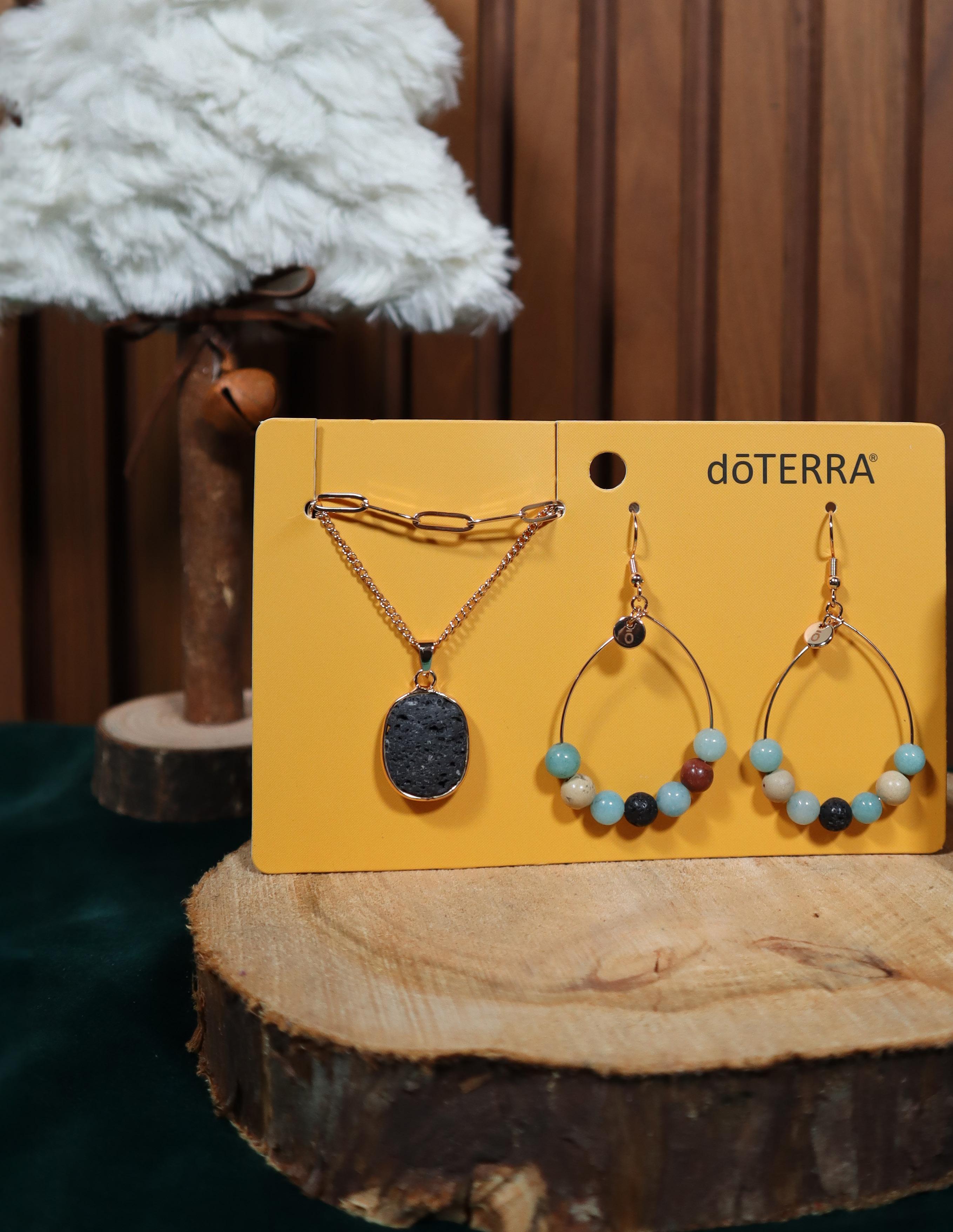 Este elegante set de joyería incluye un collar y unos aretes difusores, diseñados para que puedas llevar tus aceites esenciales favoritos de una forma sutil y con estilo. Su combinación de materiales y piedras naturales crea un acabado moderno y sofisticado.