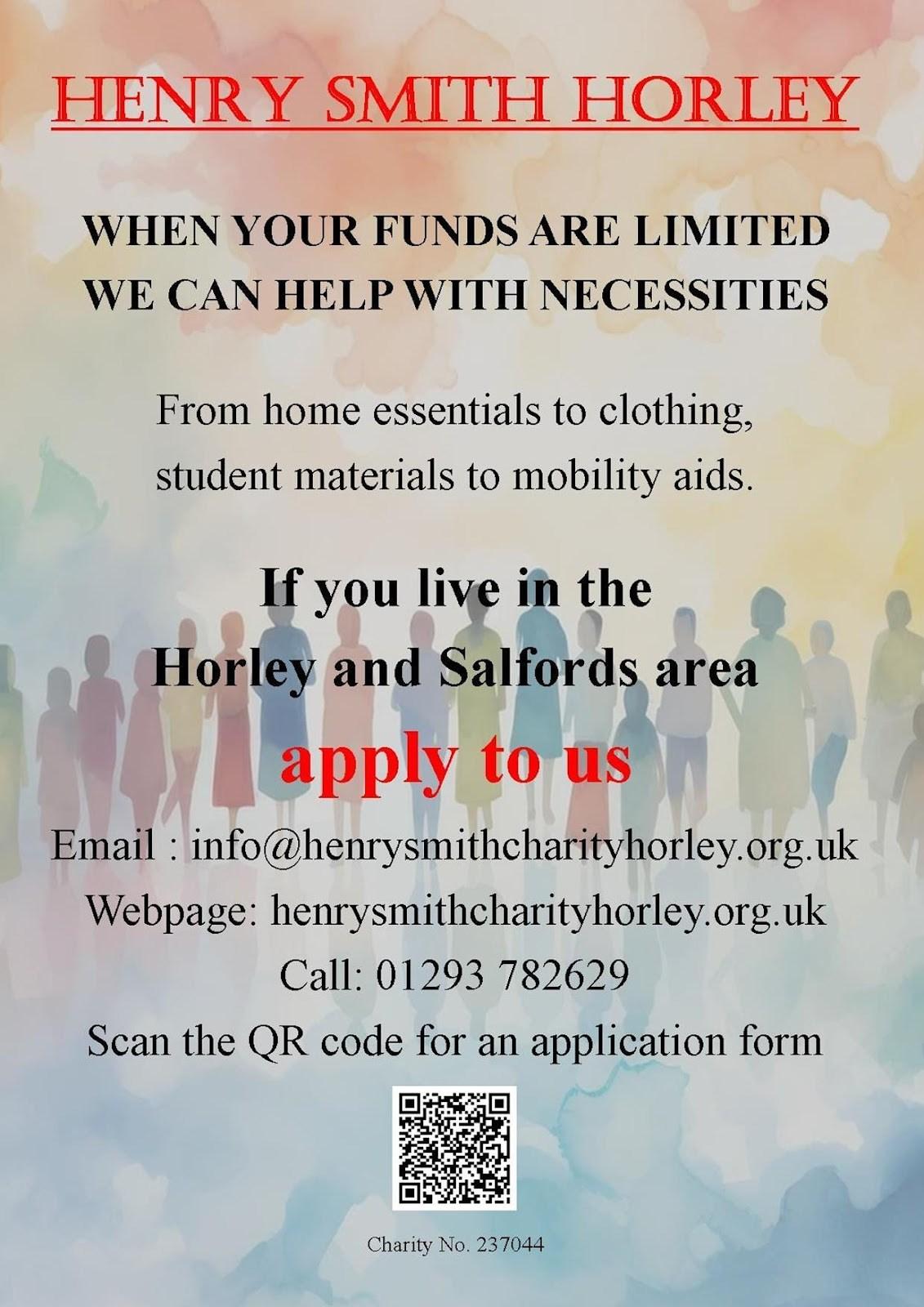 All you have to do is contact us. There’s no cost or obligation for you. So why not visit our website, download an Application Form, fill it in then email or text it to us. Everything is confidential and we’ll sort things out quickly. www.henrysmithcharityhorley.org.uk A little help towards a brighter future