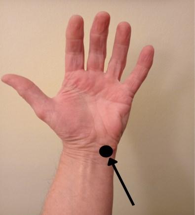 • Step 2: locate the small indentation just under the hand bone as marked in the photo.