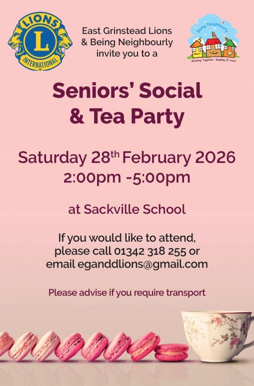 On Saturday 28th February 2026, the East Grinstead & District Lions Club are delighted to invite all Seniors to their delicious tea party and social afternoon. The event will run from 2:00pm-5:00pm, it is free to all and will again be held at Sackville School in the Main Hall.
