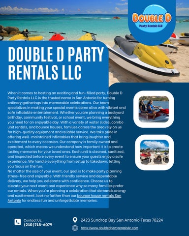 When it comes to hosting an exciting and fun-filled party, Double D Party Rentals LLC is the trusted name in San Antonio for turning ordinary gatherings into memorable celebrations. Our team specializes in making your special events come alive with vibrant and safe inflatable entertainment. Whether you are planning a backyard birthday, community festival, or school event, we bring everything you need for an enjoyable day. With a variety of water slides, combo unit rentals, and bounce houses, families across the area rely on us for high-quality equipment and reliable service. We take pride in offering well-maintained inflatables that bring laughter and excitement to every occasion. Our company is family owned and operated, which means we understand how important it is to create lasting memories for your loved ones Each unit is cleaned, sanitized, and inspected before every event to ensure your guests enjoy a safe experience. We handle everything from setup to takedown, letting you focus on the fun.