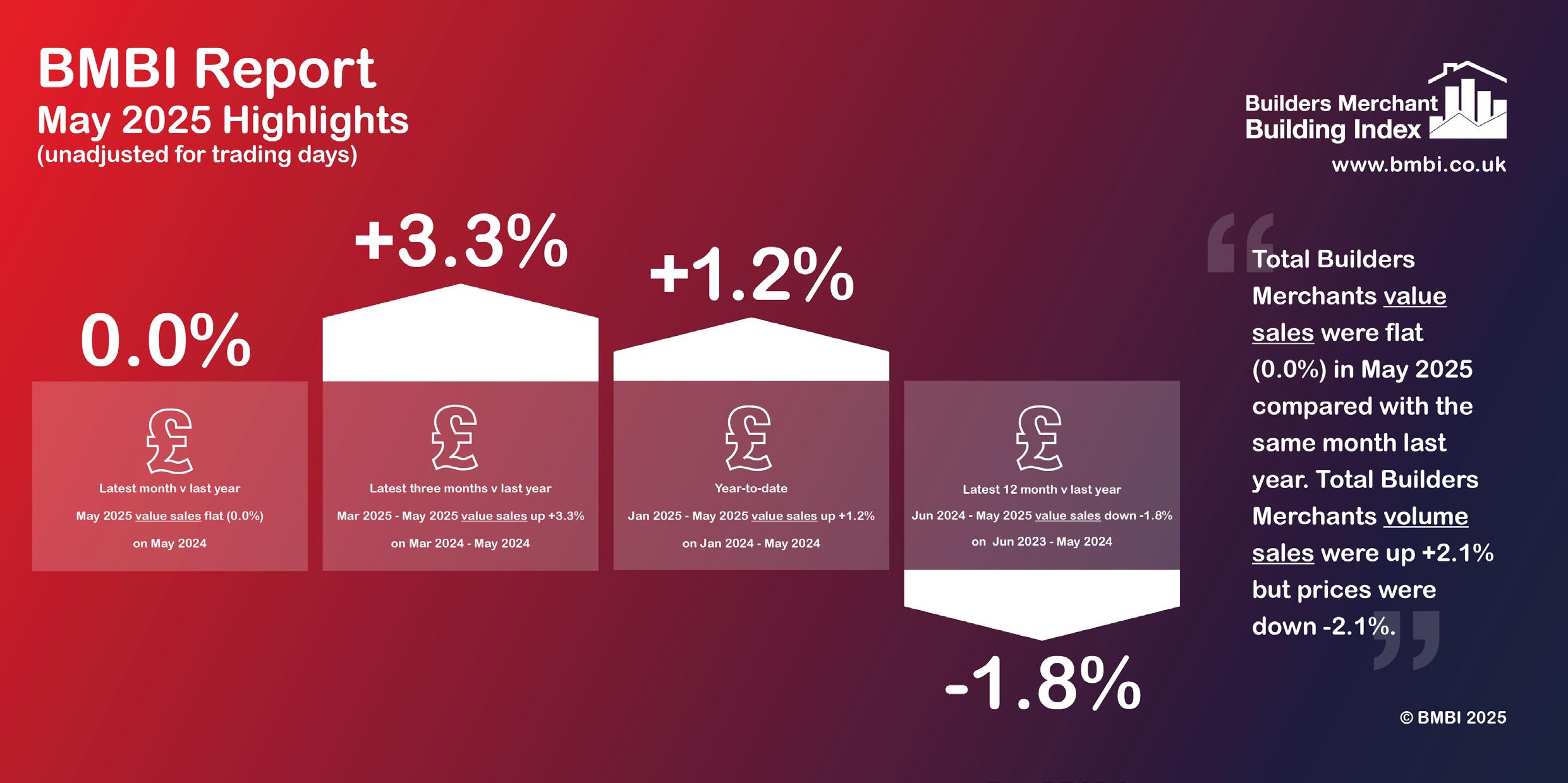The latest Builders Merchant Building Index (BMBI) report, published in July, shows builders’ merchants’ total value sales in May were unchanged (0.0%) compared to May 2024. Year on year volumes rose +2.1% but prices fell -2.1%. With one less trading day in the most recent period, like-for-like value sales, which take trading day differences into account, were up +5.0%.
