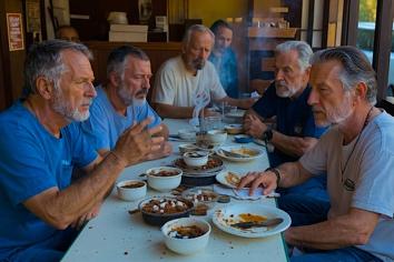 The rest went in for mute, uninflected colours. Short-clipped hair. A few beards. The terse talk of men who know their work. Laughs. A cough. Quick puffs at cigarettes tucked between twigs of an olive tree.