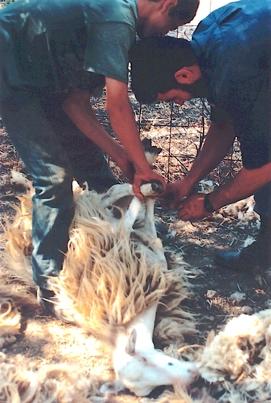 Shearing was methodical. Four men worked in pairs. They knelt on a thick mat of fresh-cut wool, one pulling the fleece while the other man sheared. The shearers wielded broadbladed garden-trimming shears with no pins. Instead, a loop around the back provided the springiness. The blade tips were wedge-like to part the thick wads of wool. The basic sequence