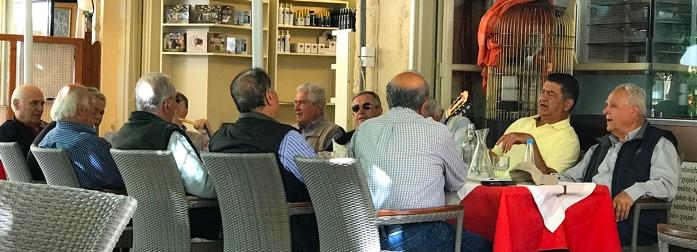 The men wore stolid work-faded pants. Rolled-up sleeves. Thick-soled boots for olive-country’s gummy soils. Mihalis wore suspenders — dandyish for this part of Crete, but then, he is from Xaniá.
