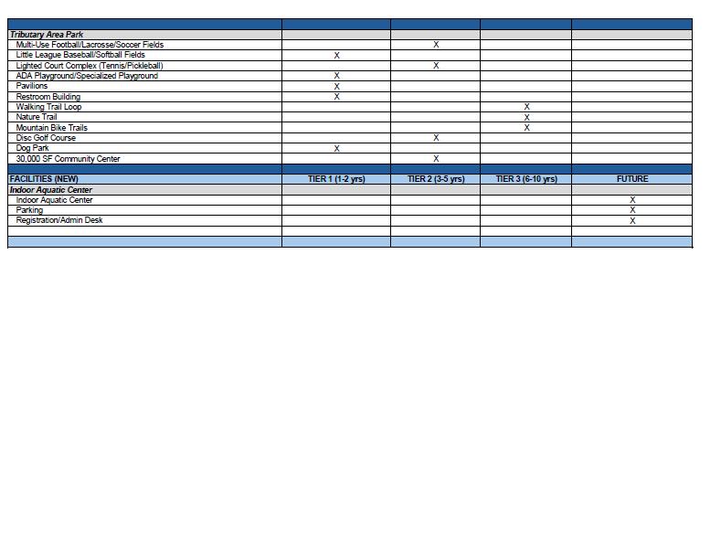 A 10-year capital improvement plan serves as a guiding document for department staff and elected officials to strategically implement the recommended improvements in this plan. A tiered prioritization schedule was developed to identify immediate needs and long-terms goals. Immediate needs identified in Tier 1 (0-2 years) include addressing deferred maintenance issues for existing parks and facilities, low-impact expansions to existing parks, and planning efforts for larger projects in subsequent years. These Tier 1 recommendations also include renovations to address ADA, security/ safety and maintenance issues in the parks that will provide an immediate improvement to the overall quality and enjoyment of these facilities.