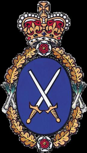 “Two swords in saltire Argent hilts pommels and quillons Or that in bend couped at the point charged upon on Oval Azure environed by a Wreath composed of Oak Leaves Gold with in chief and in base a Tudor Rose Gules upon Argent barbed and seeded proper and in the flanks two Leeks in saltire also proper the whole ensigned by the Royal Crown proper.”