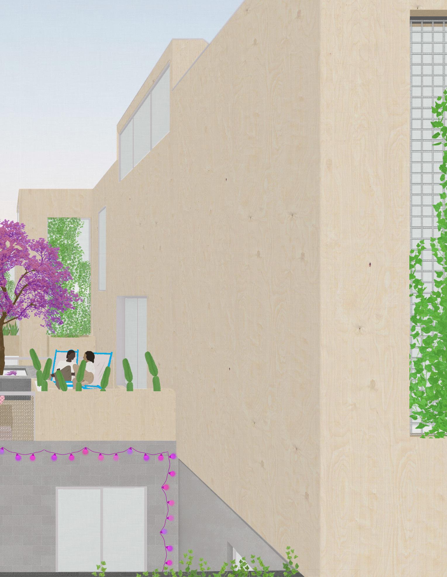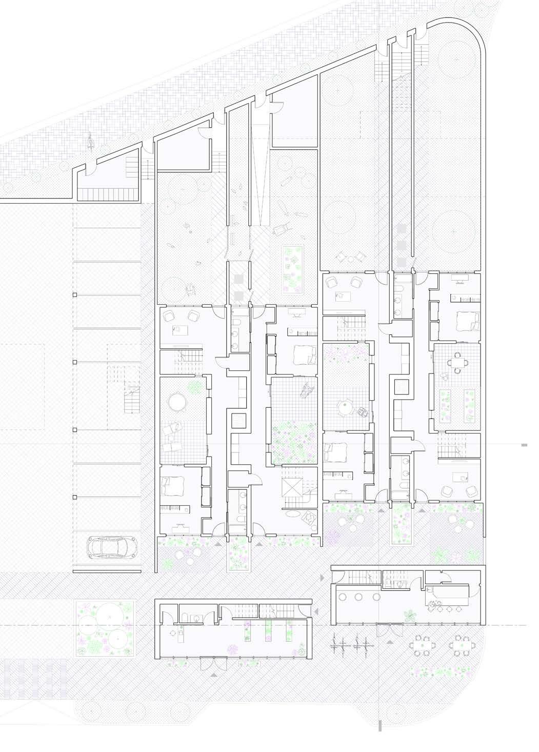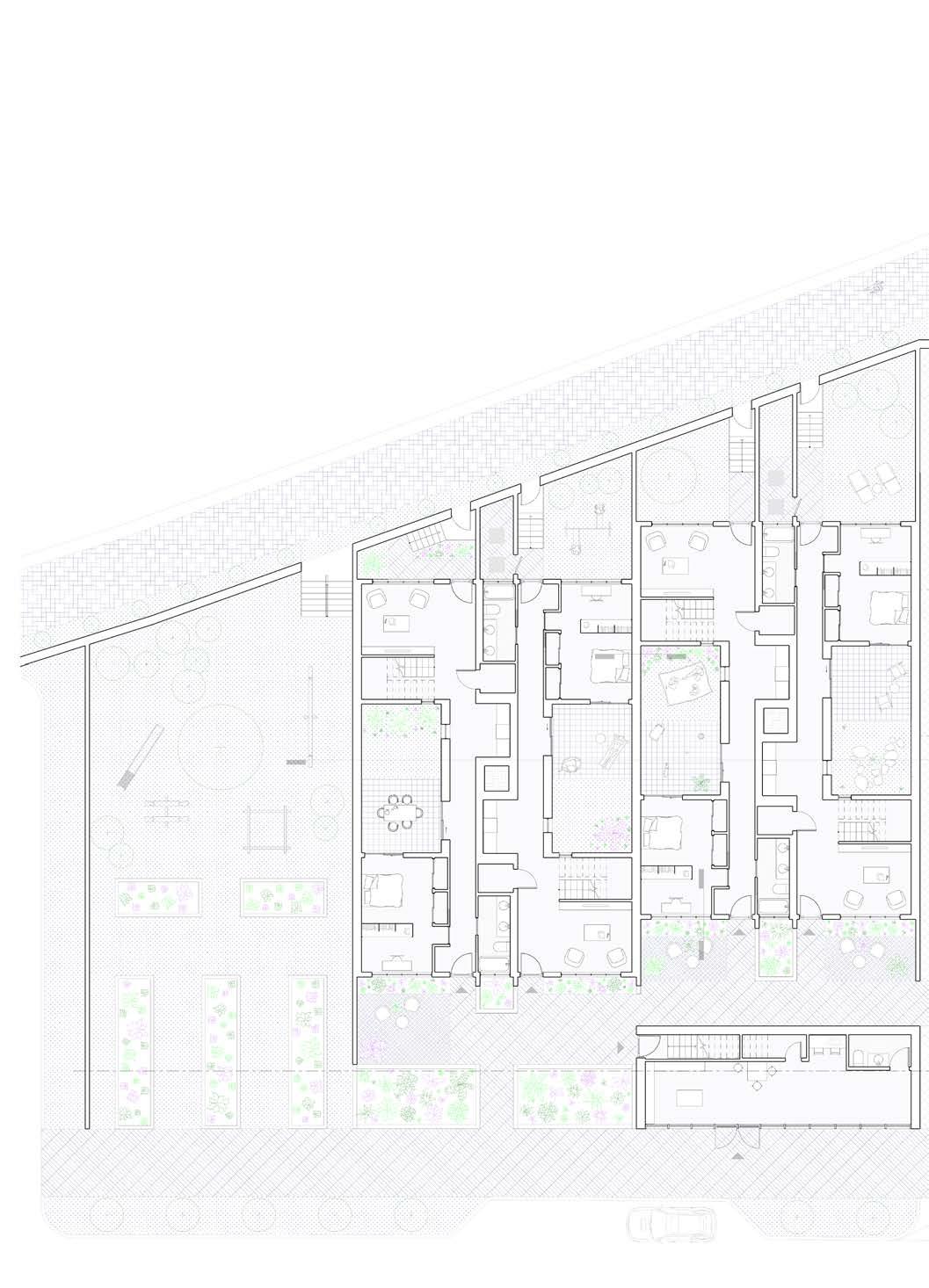This project explores the duality between private ownership and unit independence afforded by the spatial division of a party walls and the cohesive network created by their agglomeration. As both a part to a whole and a unique condition by its situation on the site, a unit becomes an agent of both individuality and collectivity. Above the ground floor, the party walls are rotated 90 degrees to loosen into a systemic employment of spatial division. This rotation subverts the single directionality of the typical rowhouse scheme and creates a weaving pattern of unit formation. This project breaks down the monotony of a typical rowhouse scheme with surprising moments of collectivity and sharedness while still preserving the integrity of the independent unit.