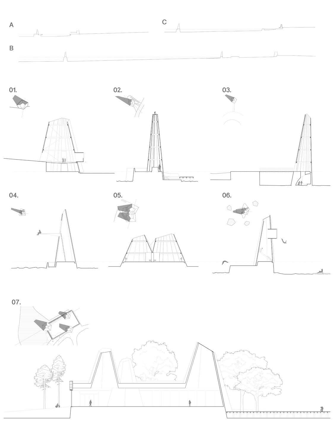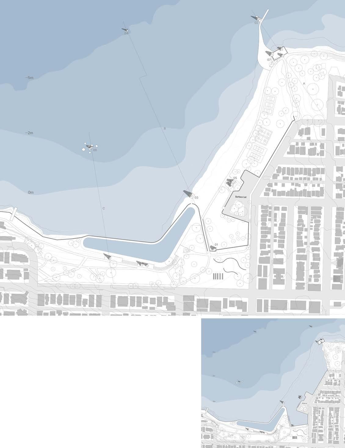 The public space of Vancouver is primarily defined by the sea wall paths, beaches, and pocket parks along the shore of Vancouver Bay. These linear causeways define an episodic space, where nodal points of gathering offer a respite from the causeway’s velocity. A public intervention adds a third dimension to this matrix: time. As the public space has been pushed to the peripheral and hard-to-build upon tidal lanes, it is caught in between development and rising sea levels. In order to mark these shifts in ground, a series of public platforms are placed throughout Kitsilano Beach Park to act as a climatic ruler. The years 2025, 2050, 2075, and 2100 are recognizable sectional datums across the site. At the year 2100 datum, lightweight inhabitable lanterns are tied to the platforms to denote social spectacle and occasion. Slowly, as the water rises on the site, the public space and relationships between these platforms shift, expressing a further fragmentation of public life.