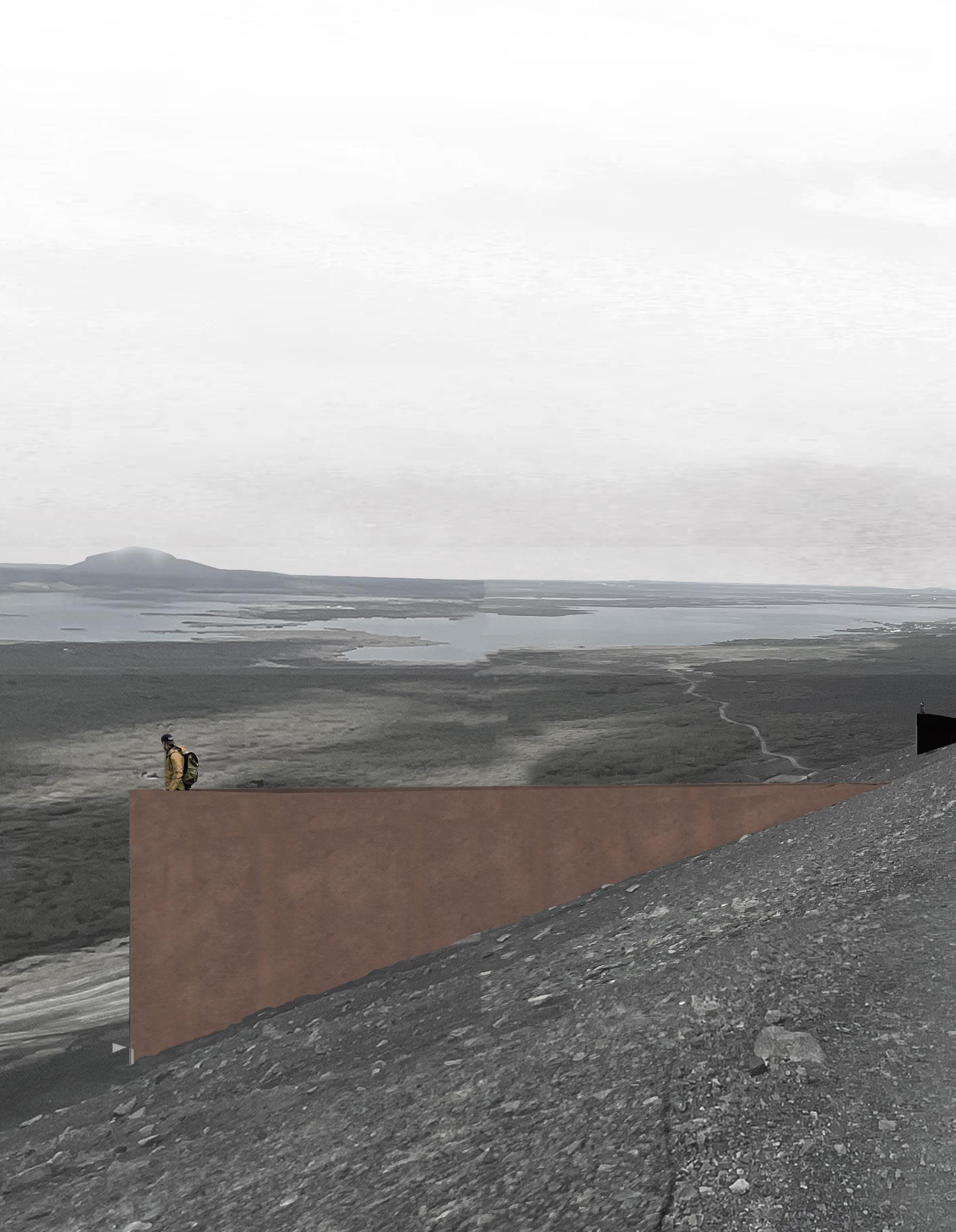 This project was submitted as an entry for Bee-Breeders ‘Iceland Volcano Lookout Point’, a place for hikers to rest and remark on the rim trail of Hverfjall Volcano. This project seeks to recognize Hverfjall’s geologic history through simple extrusions from the trail’s edge. 7 Blades erupt from the hillside to act as vectors for hikers to extend themselves. The public space, the nook of a collision, uses this datum to highlight a descent into the crater.