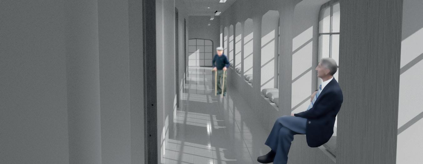 L’intérieur et l’extérieur reprennent le même fond. Le but est de parcourir la grande ligne droite tout en s’arrêtant à certains espaces avant. Les temps de pause et de respiration sont marqués par des zones un peu creusées dans le sol.