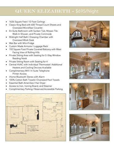 1636 Square Feet | 12 Foot Ceilings Classic King Bed with 600 Thread Count Sheets and Oversized Microfiber Coverlet En-Suite Bathroom with Sunken Tub, Mosaic Tile Walk-In Shower, and Private Commode Midnight Half Bath | Dressing Chamber with Oversized Work Desk Wet Bar with Mini-Fridge Custom Made Armoire | Luggage Rack 192 Square Foot Private Covered Balcony with West Facing View of Rolling Hills Private Sitting Area with Seating for 5 | Bay Window Reading Nook Private Sitting Room with Seating for 4 Central HVAC with Individual Thermostat | Additional Heaters and Cooling Devices Available Complimentary Wifi | In Suite Telephone Printer Access iHome Bluetooth Stereo with Alarm 100% Cotton Bath Towels | Oversized Pool Towels Essential Bath Amenities | Hair Dryer Access to Iron, Ironing Board, and Steamer Complimentary Parking | Reserved Accessible Parking