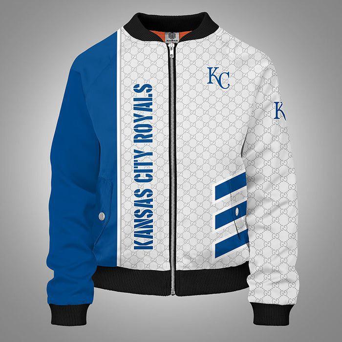 Introducing the Kansas City Royals Blue Unisex Bomber Jacket by Gucci Luxury. Step up your fashion game and show your unwavering support for your favorite baseball team with this iconic piece. Crafted with meticulous attention to detail, this jacket exudes a perfect blend of style and comfort.