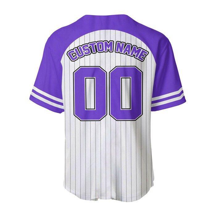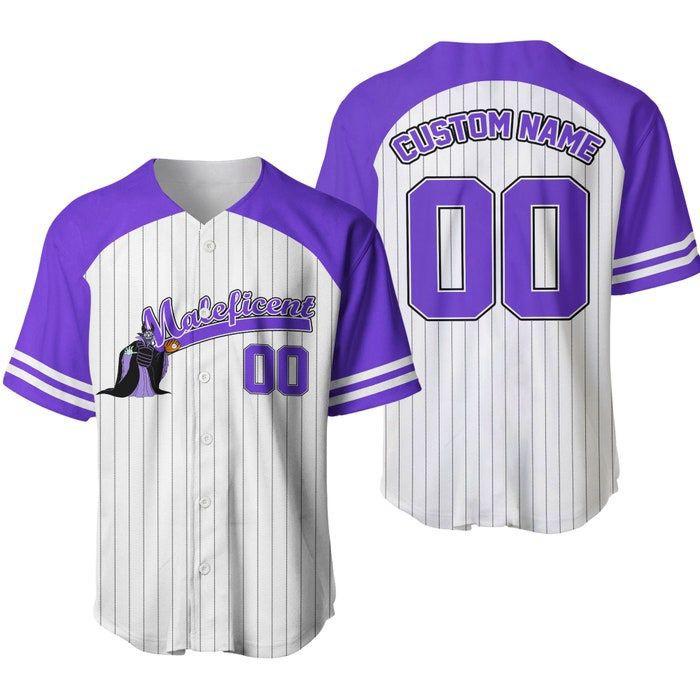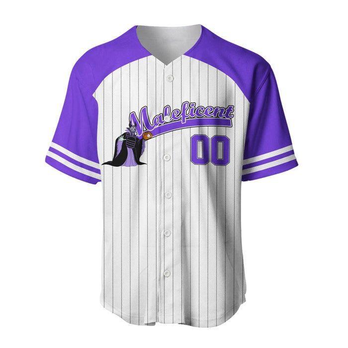 Introducing our Maleficent Striped Purple White Unisex Cartoon Graphic Casual Outfit Custom Baseball Jersey! Step up your style game with this unique and eye-catching jersey, designed to turn heads and make a statement.