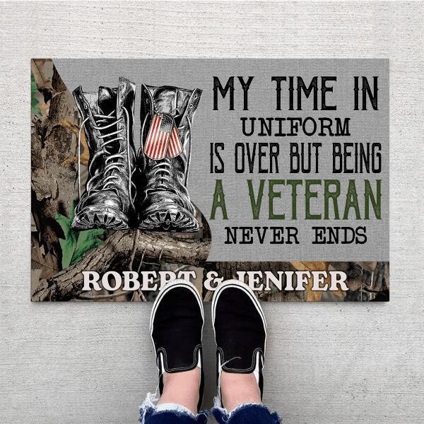 Introducing our "My Time In Uniform Is Over But Being A Veteran Never Ends" Personalized Doormat Welcome Mat! This one-of-akind home decoration is the perfect gift for veterans, honoring their service and sacrifice.