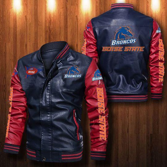 The Boise State Broncos Leather Bomber Jacket is the ultimate statement piece for any die-hard fan. Made from high-quality leather, this jacket exudes both style and durability. Its sleek design features the iconic Boise State Broncos logo on the chest, showcasing your unwavering team loyalty. With a comfortable fit and ribbed cuffs and waistband, it offers a snug and cozy feel. The jacket also boasts multiple pockets, providing ample storage for your essentials. Whether you're heading to a game or simply want to flaunt your team pride, this jacket is a must-have. Not only does it keep you warm during colder months, but it also elevates your fashion game. With its timeless design and superior craftsmanship, this jacket is truly a valuable addition to your wardrobe. Show off your support for the Boise State Broncos in style and make a bold statement wherever you go.