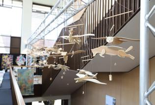 In addition, there were beautifully crafted Key Stage 3 insect, fish and ‘scene’ sculptures as well as flying bird mobiles hung from a scaffold gantry over the stairwell.