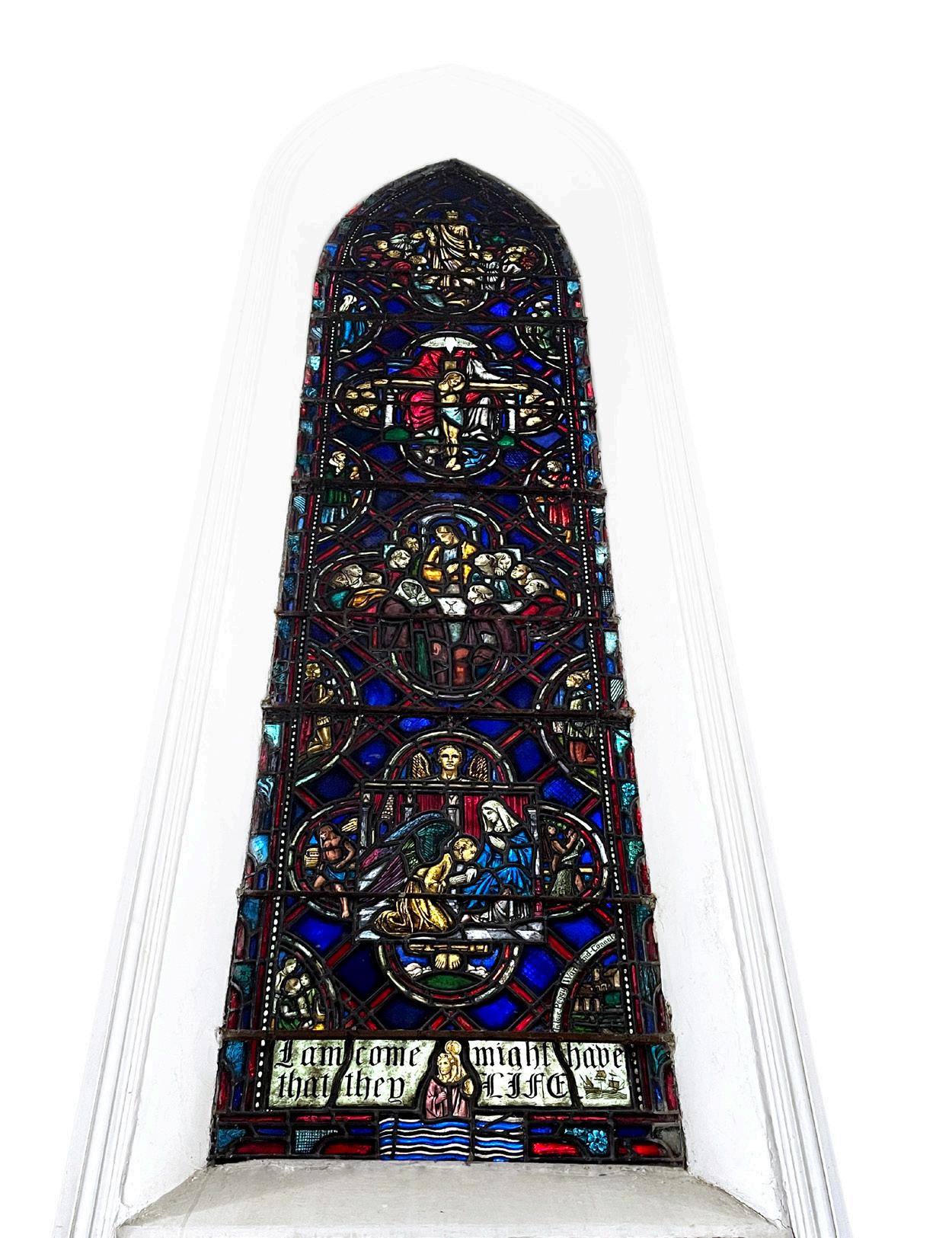 to Lithiby, represents “a scheme of redemption” whereby the story of Christ is told simultaneously with the redemption of men, women and children. The window should be read from the bottom upwards, with Christ in glory standing with disciples surrounding him at the top.