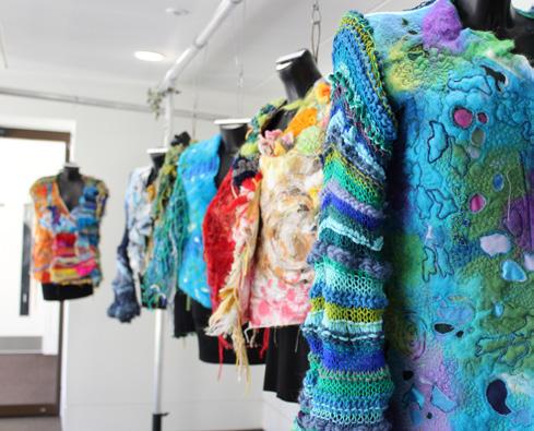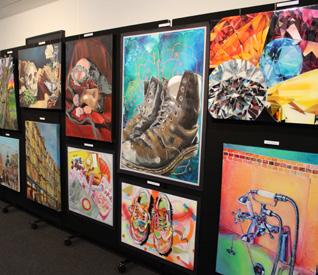 Garments by A Level Textiles students were the focal point at the entrance of the main exhibition in the Murray Centre and demonstrated skill, flare, imagination, and the fusion of an array of creative techniques. GCSE pieces were displayed on the lower floor and were hung from scaffold so that viewers were afforded an interactive experience.