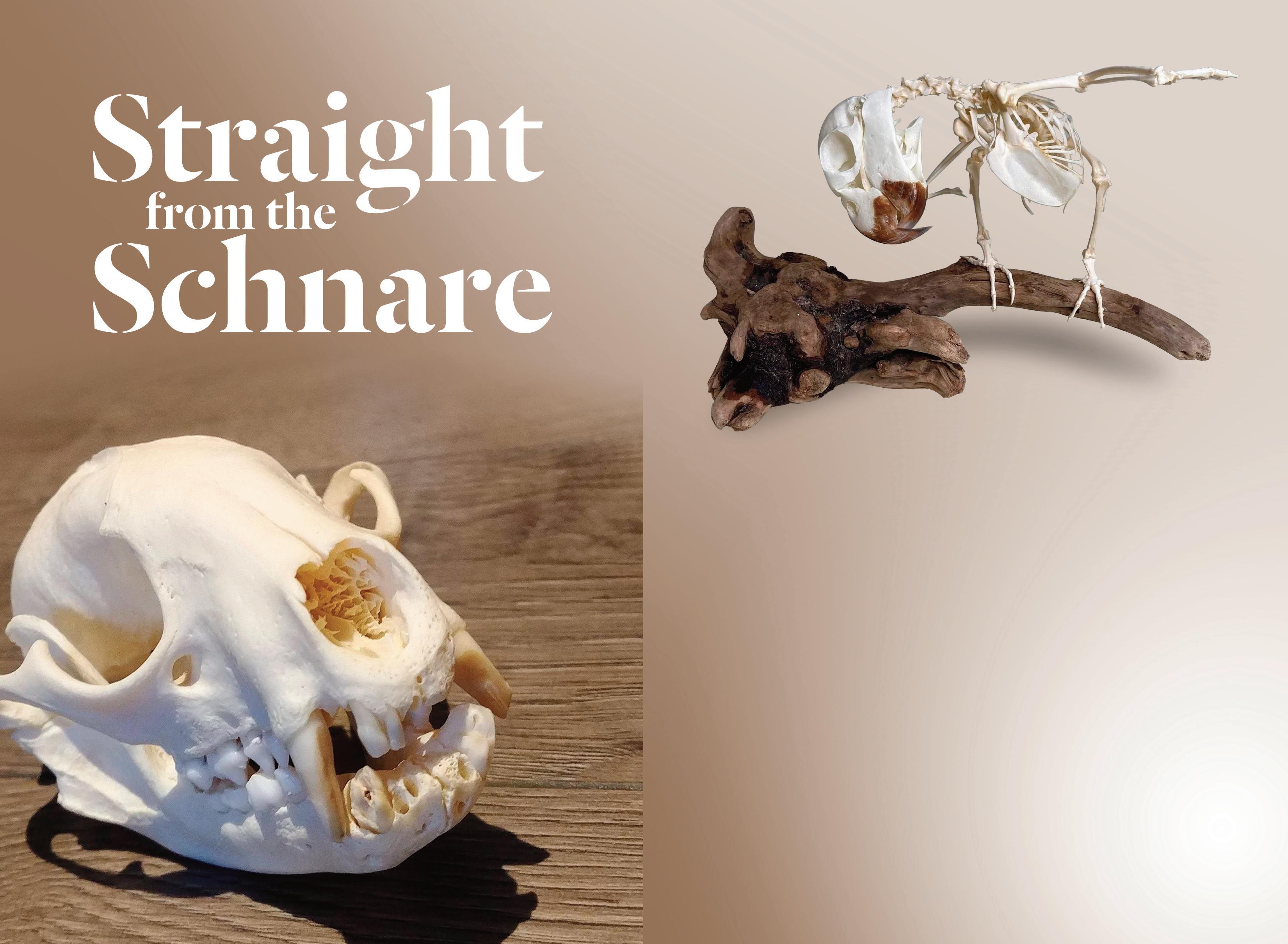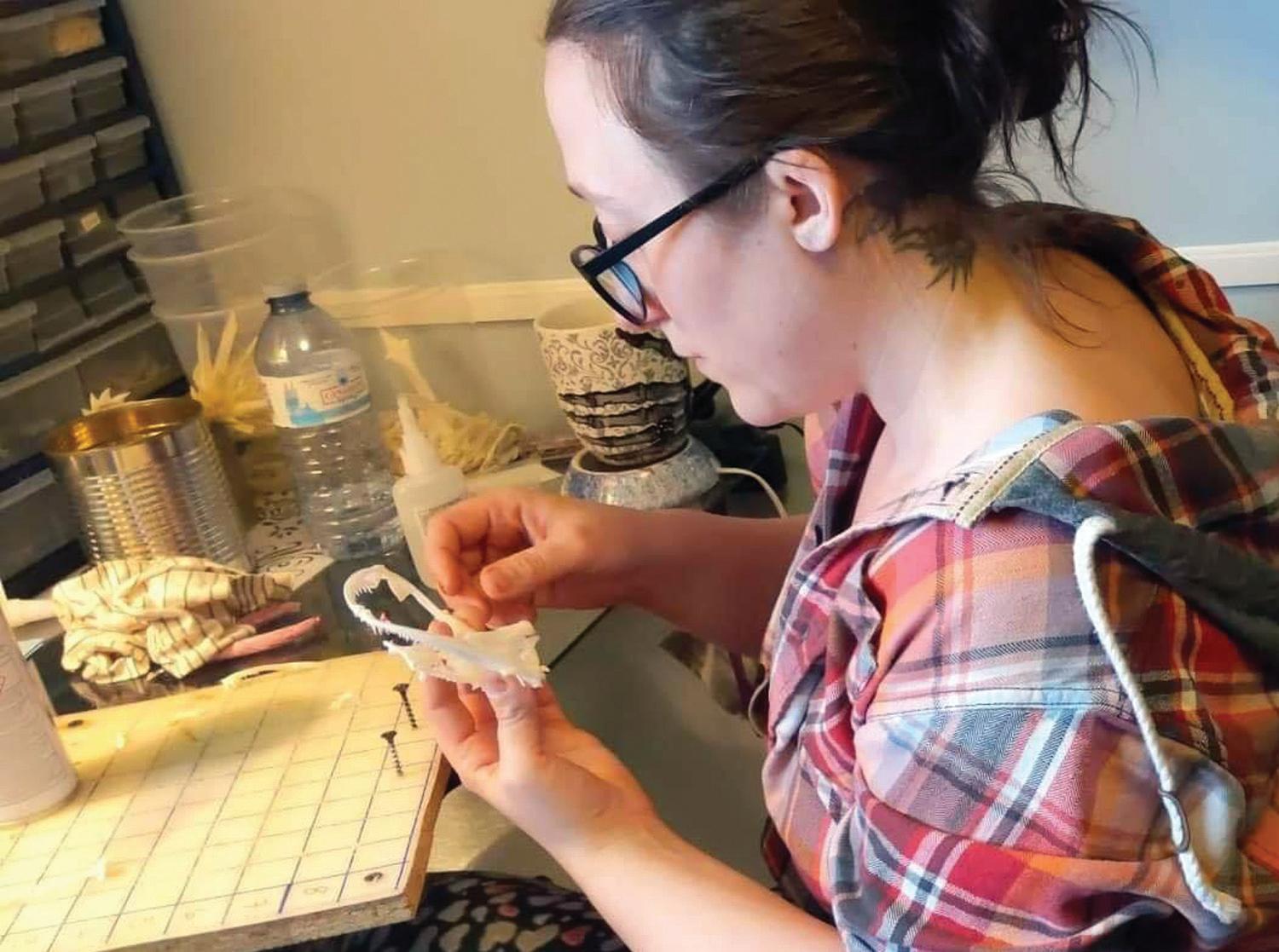 explains. For example, to articulate a skeleton, it may require skinning and defleshing. Dermestid beetles are often used to strip the flesh from the bones, but sometimes bones are left outside or buried and “nature cleaned,” or they use maceration or oxidation to clean the remaining flesh from the bone. After that it’s degreasing in warm, soapy water, which will sometimes take years. “Once all the grease has been leached out, we will then whiten them with a peroxide mixture, dry them and rearticulate it,” she says.