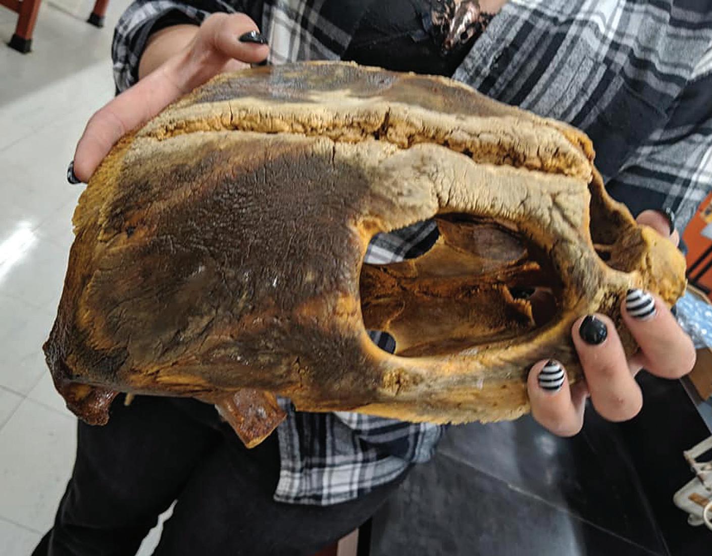 The longest project they’ve worked on is a leatherback turtle skull for St. Francis Xavier University. “When we started it a little over three years ago, it was already just bone, but it was so greasy it was like picking up something covered in old peanut butter,” Savanna says. “We are still degreasing it today.”