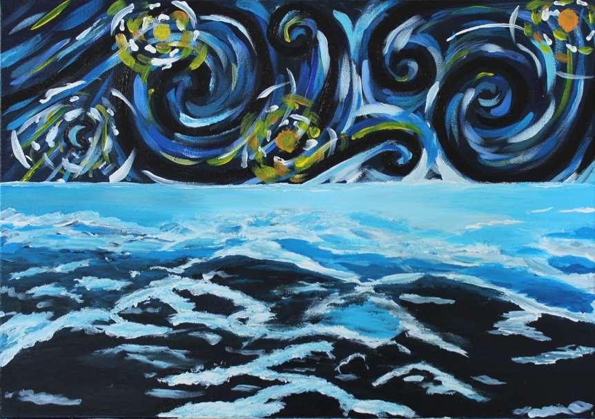 As I breathe in the fresh zephyr, the taste of salt sticks to my lips, alongside the smell of seaweed that clings to my nostrils. Steadily, the wind whispers long-kept secrets into my keen ears as the woosh of the waves tries to drown them out. The boundless ocean decides to playfully nibble my feet before fizzling into the hot sand. Just as before, the waves lick my feet and then disperse into a tapestry of white galore. Calmly, I look further out at the uncontainable sapphire-hued sea: it twinkles with admiration for the gleaming sun,