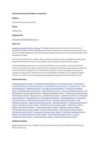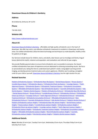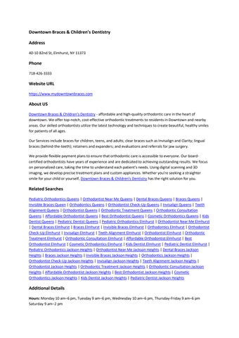Phone 718-426-3333 About US Downtown Braces & Children’s Dentistry - affordable and high-quality orthodontic care in the heart of downtown. We offer top-notch, cost-effective orthodontic treatments to residents in Downtown and nearby areas. Our skilled orthodontists utilize the latest technology and techniques to create beautiful, healthy smiles for patients of all ages. Related Searches Pediatric Orthodontics Queens | Orthodontist Near Me Queens | Dental Braces Queens | Braces Queens | Invisible Braces Queen | Orthodontics Queens | Orthodontist Check-Up Queens | Invisalign Queens | Teeth Alignment Queens | Orthodontist Queens | Orthodontic Treatment Queens | Orthodontic Consultation Queens | Affordable Orthodontist Queens | Best Orthodontist Queens | Cosmetic Orthodontics Queens | Kids Dentist Queens | Pediatric Dentist Queens | Pediatric Orthodontics Elmhurst | Orthodontist Near Me Elmhurst | Dental Braces Elmhurst | Braces Elmhurst | Invisible Braces Elmhurst | Orthodontics Elmhurst | Orthodontist Check-Up Elmhurst | Invisalign Elmhurst | Teeth Alignment Elmhurst | Orthodontist Elmhurst | Orthodontic Treatment Elmhurst | Orthodontic Consultation Elmhurst | Affordable Orthodontist Elmhurst | Best Orthodontist Elmhurst | Cosmetic Orthodontics Elmhurst Additional Details Hours: Monday 10 am–6 pm, Tuesday 9 am–6 pm, Wednesday 10 am–6 pm, Thursday-Friday 9 am–6 pm Saturday 9 am–2 pm Payment: cash, cc GMB Listing https://www.google.com/maps?cid=5494612398585529040