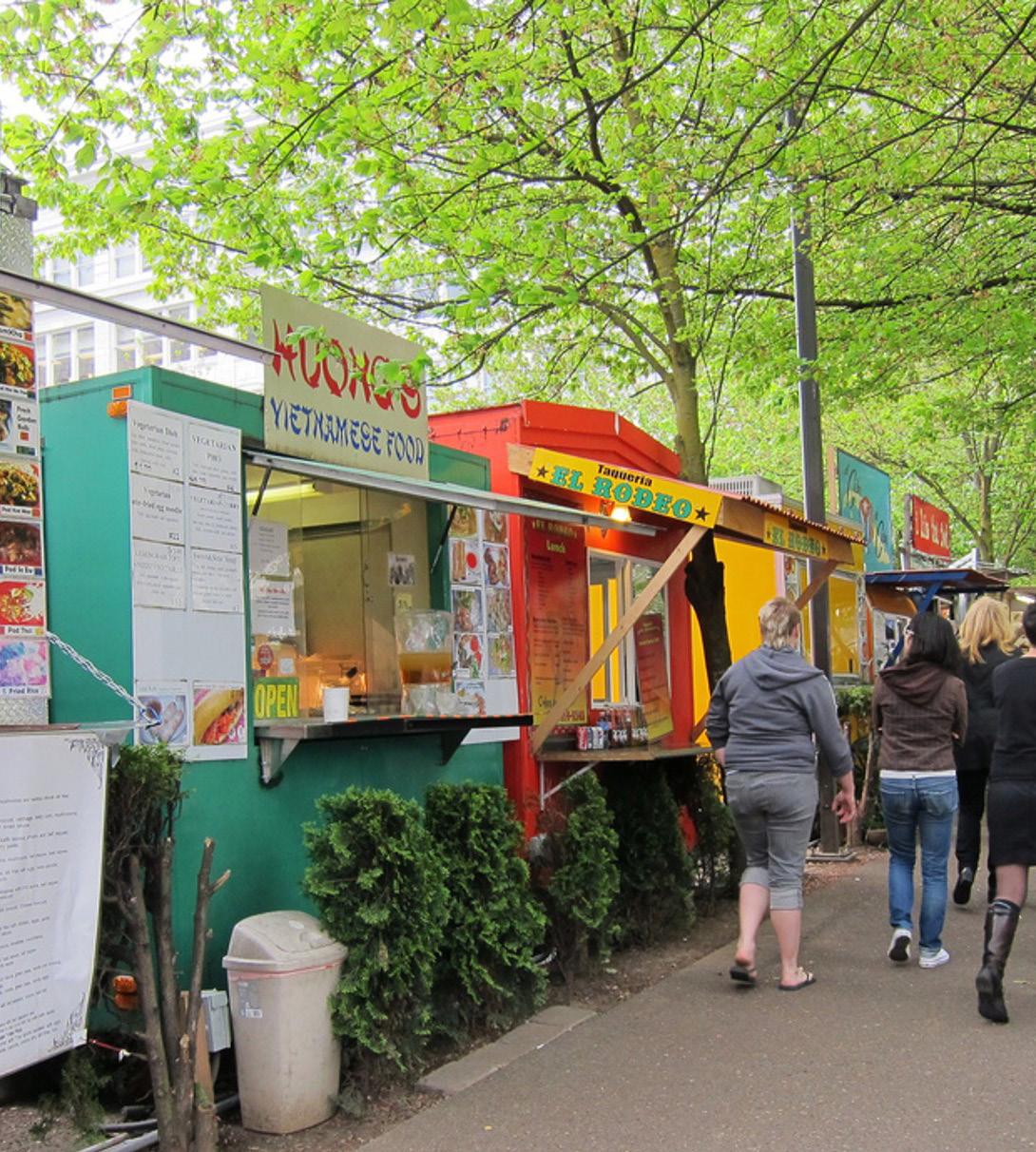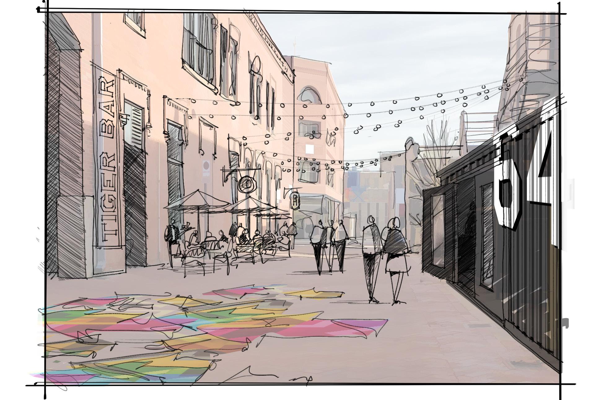 Activating underused alleyways, parking lots, or other large underutilized areas can provide depth and excitement to the urban fabric of the downtown. This example brings an overlooked alley to life with options like outdoor seating and dining, flexible container retail, festival lighting, and painted street art to draw people into the space to shop, relax, and engage with the landscape.