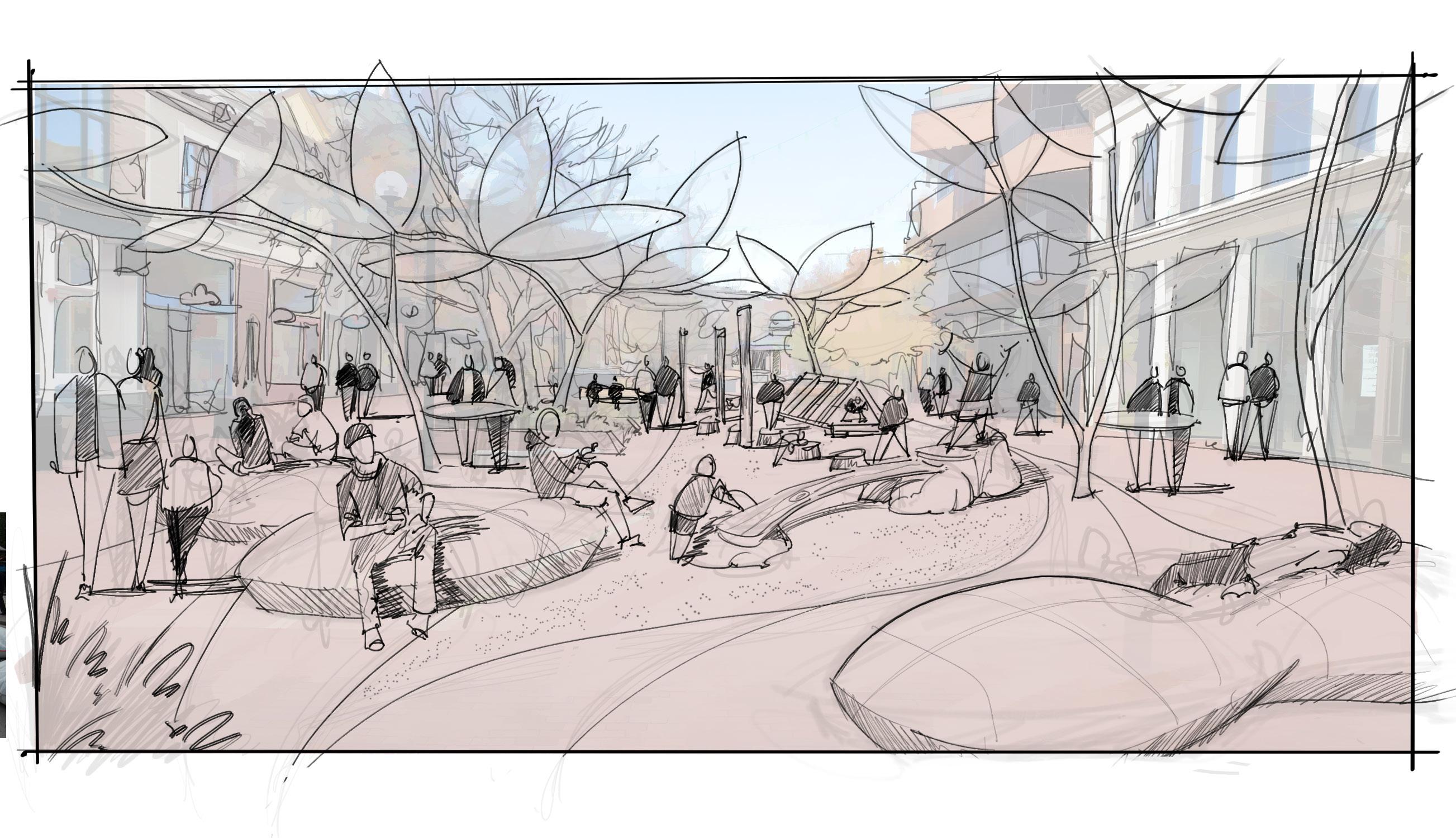 Exploring the possibilities of an activated and human-centered urban space, this example of the 1400 Block shows creative and practical public art that mimics the soul of Boulder Creek. These flexible structures double as seating, play, shade, and dining. This example is not intended to be used for specific design, but rather to inspire one to think about the possibilities of enhancing and activating an iconic part of the Mall.