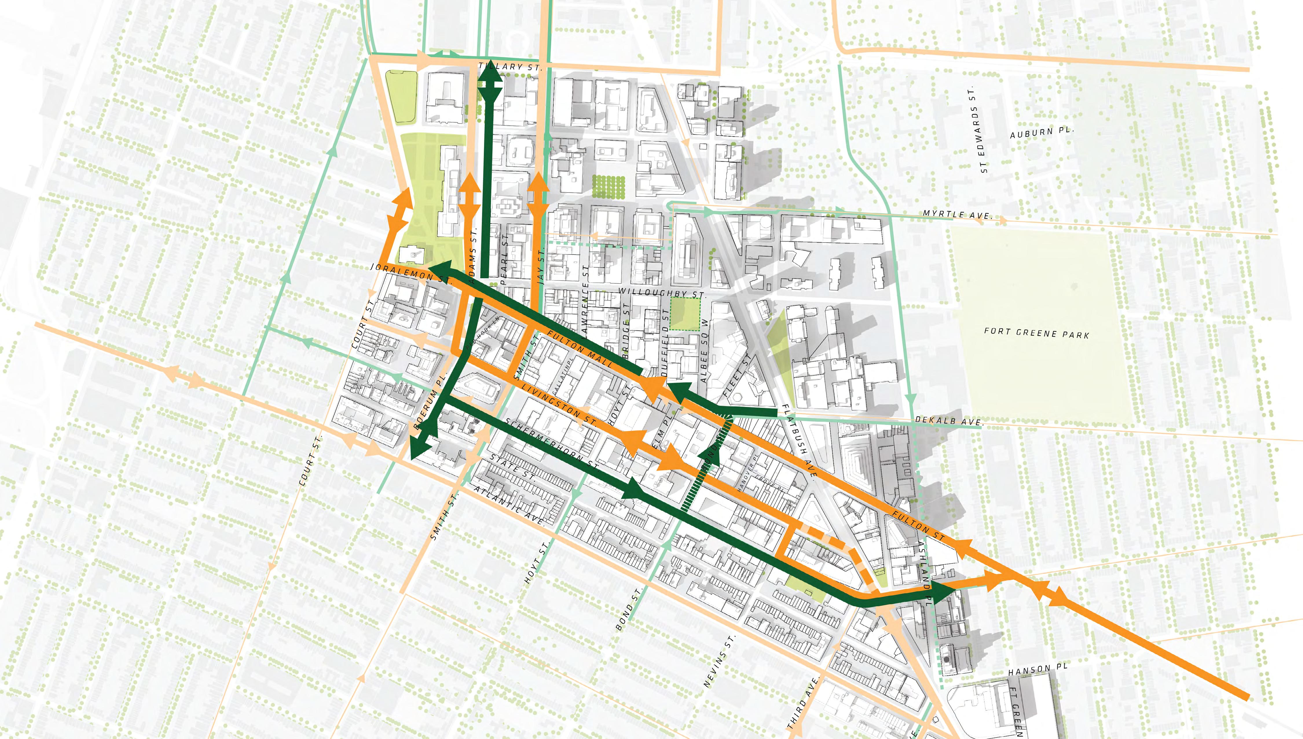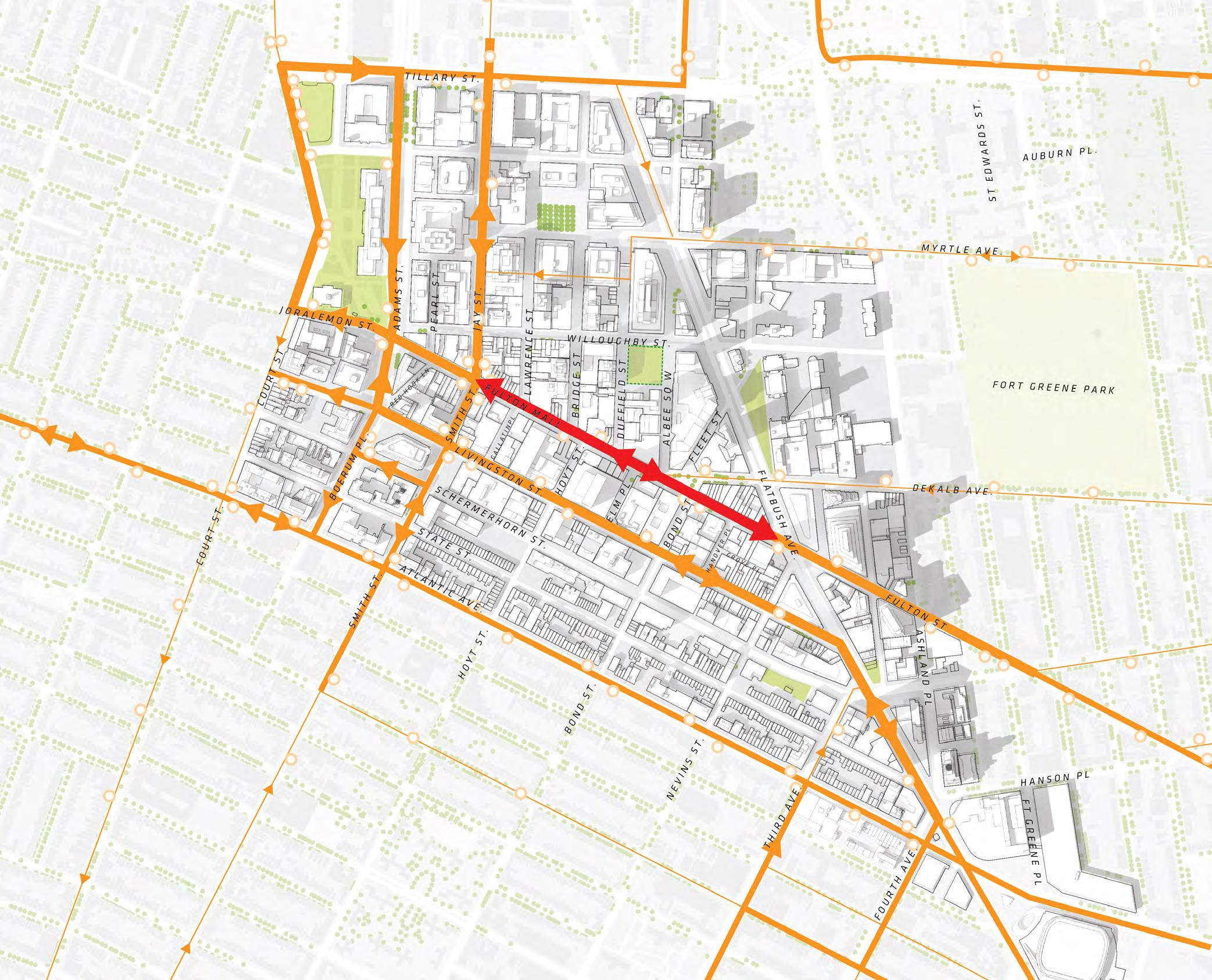 SHARED BIKE LANE BIKE LANE 2-3 BUS LINES 4+ BUS LINES 1 BUS LINE KEY PARKS & OPEN SPACES NEW WESTBOUND BIKE LANE ON FULTON STREET BIKE LANE EXTENSION FROM BROOKLYN BRIDGE EASTBOUND PROTECTED BIKE LANE ONLY SCHERMERHORN BUSES REMAIN ON FULTON STREET FULTON STREET EAST BOUND BUSES MOVE TO LIVINGSTON STREETADAMS/BOERUM