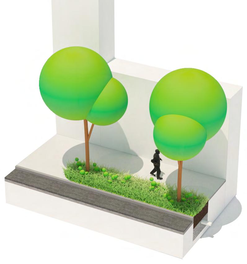 Add street trees and rain gardens to increase permeability, improve air quality, and reduce urban heat island effect