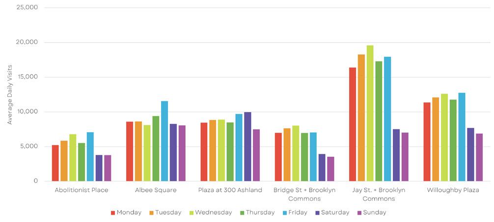 • Jay St + Brooklyn Commons saw average weekday visits between about 16,000 and 20,000 daily. Activity tended to peak at 5 pm, with additional spikes in foot traffic at 7:30 am and 12 pm.