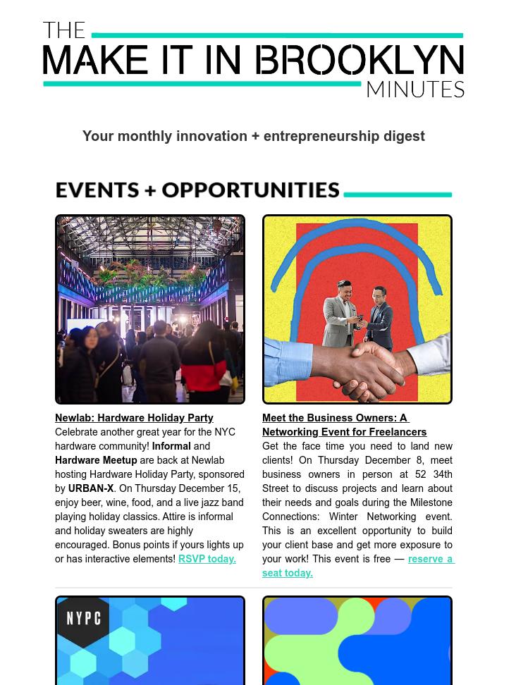 Monthly updates relevant for startups in the tech and creative sector, featuring company profiles, and info on Make It in Brooklyn events.