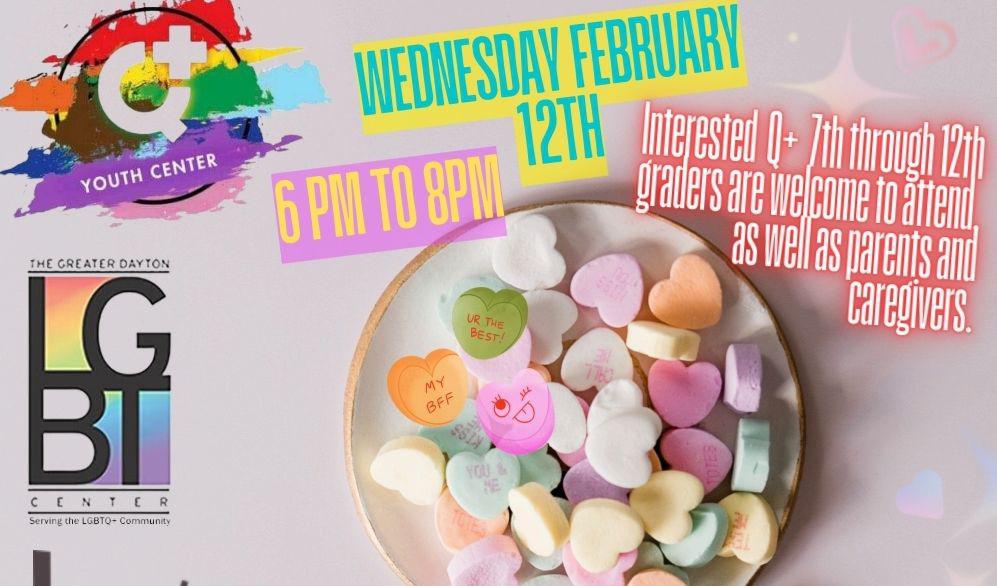 Valentine’s Day Party, Feb 12, 6pm - join us for our first event! Food, music, crafts, and more for Q+ youth, 7-12th grade at the LGBT Center
