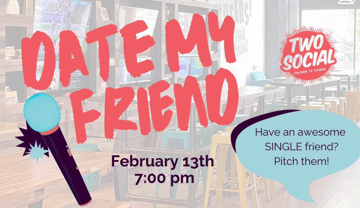 Date My Friend, Feb 13, 7pm - pitch your amazing single friend, come to mingle, or come for the vibes, it’s a night of laughs, positivity, and possibilities, $5